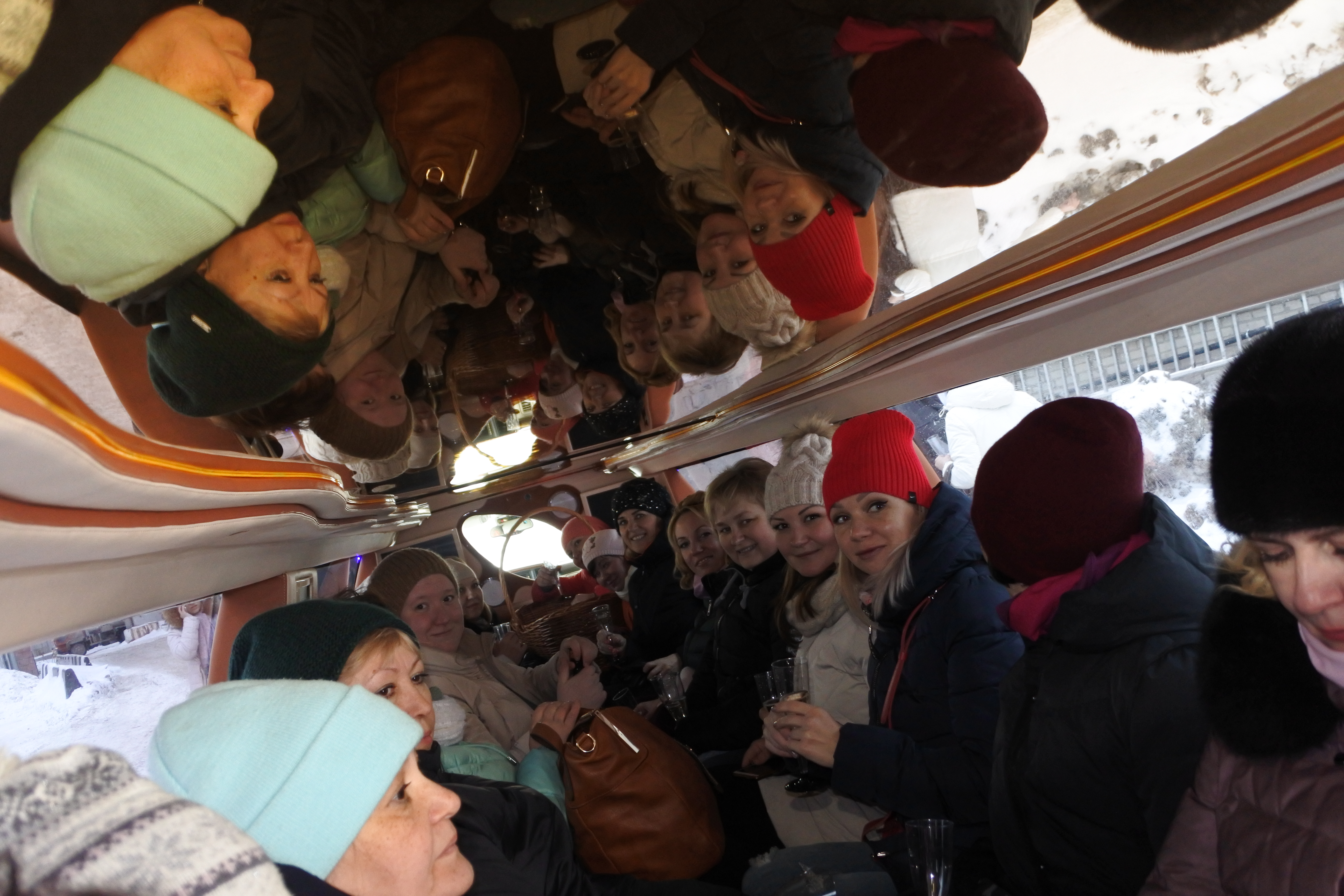 12-10 – Николай Андреевич объявляет о старте праздничного мероприятия и сообщает о том, что женщины побегут под сопровождение клаксонов. И тут на территорию въезжают 2 лимузина под грохот бурных оваций!!! Женский состав, загрузившись в кортеж, отправился в неизвестном для них направлении. Что только не приходило на ум женщин: «мы едем в театр», «сейчас покатают, привезут обратно и пойдем работать», «так красиво на спортивные состязания еще никто не приезжал». Эти мысли развеялись, когда все близлежайшие школы оказались позади, а театров по направлению движения кортежа нет.