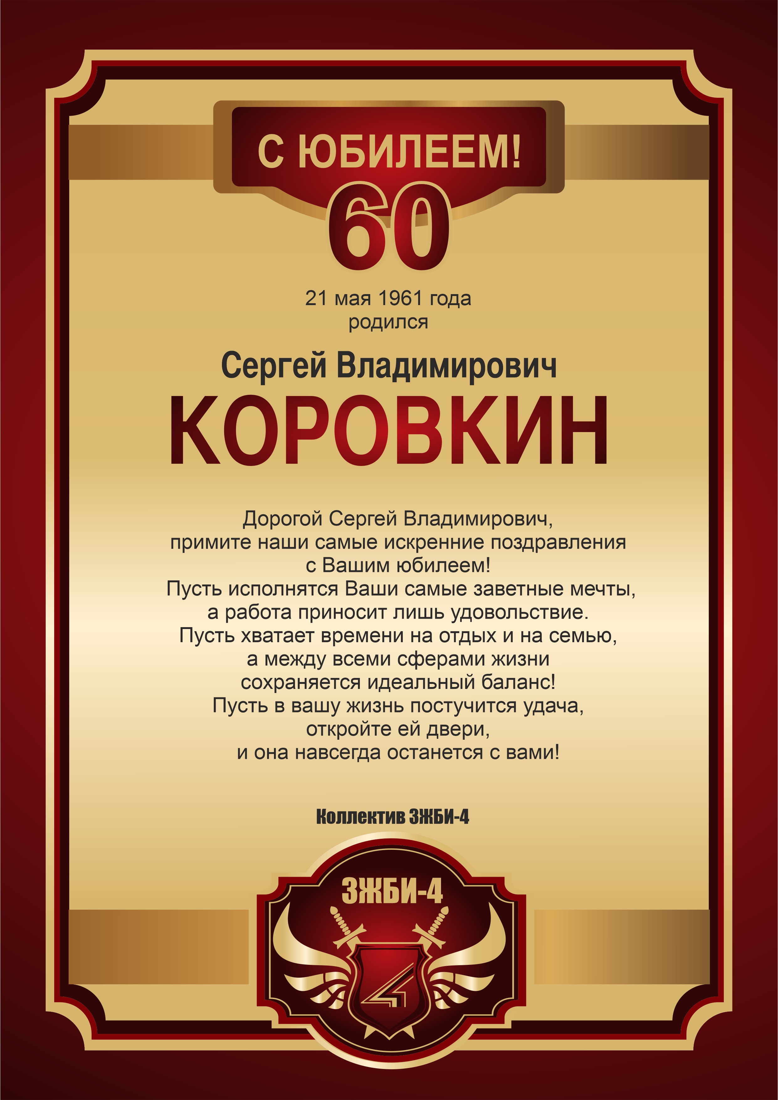 Сергей Владимирович, от всего нашего коллектива поздравляем Вас с Юбилеем! Сегодня Вы стали еще мудрее, опытнее и сильнее. Хотим пожелать Вам крепкого здоровья, щедрой любви близких людей, энтузиазма для бравой работы. Пусть в 60 лет для Вас откроется новый рубеж возможностей и роста!